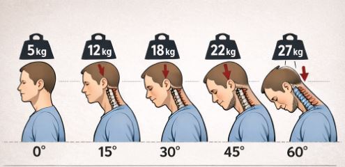 | 고개 숙인 각도 | 머리의 하중 | 정상 대비 증가율 |